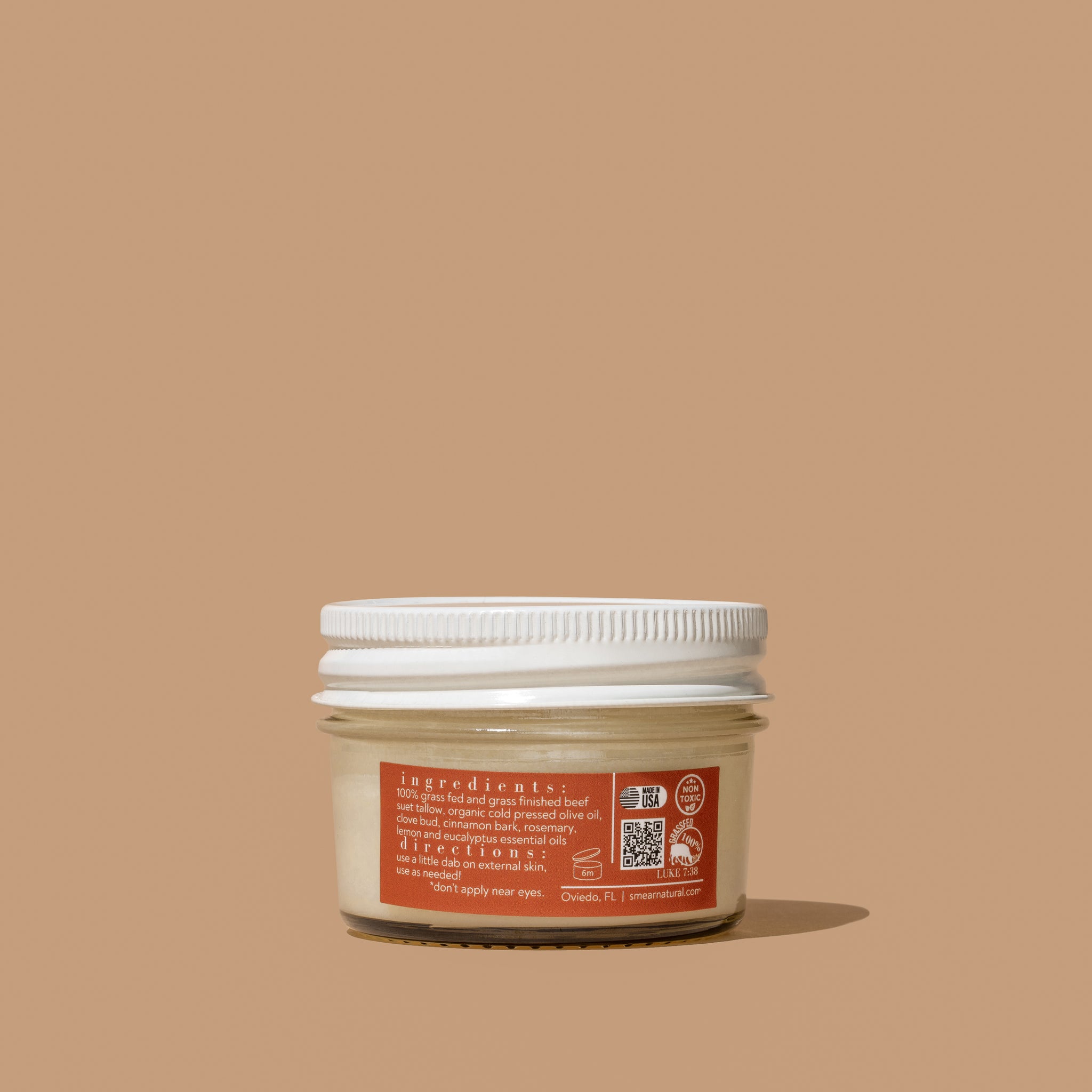 INGREDIENTS: 100% grass fed, grass-finished beef suet tallow, organic cold pressed olive oil, and these essential oils: Clove Bud, Lemon, Cinnamon Bark, Eucalyptus and Rosemary Essential Oils.